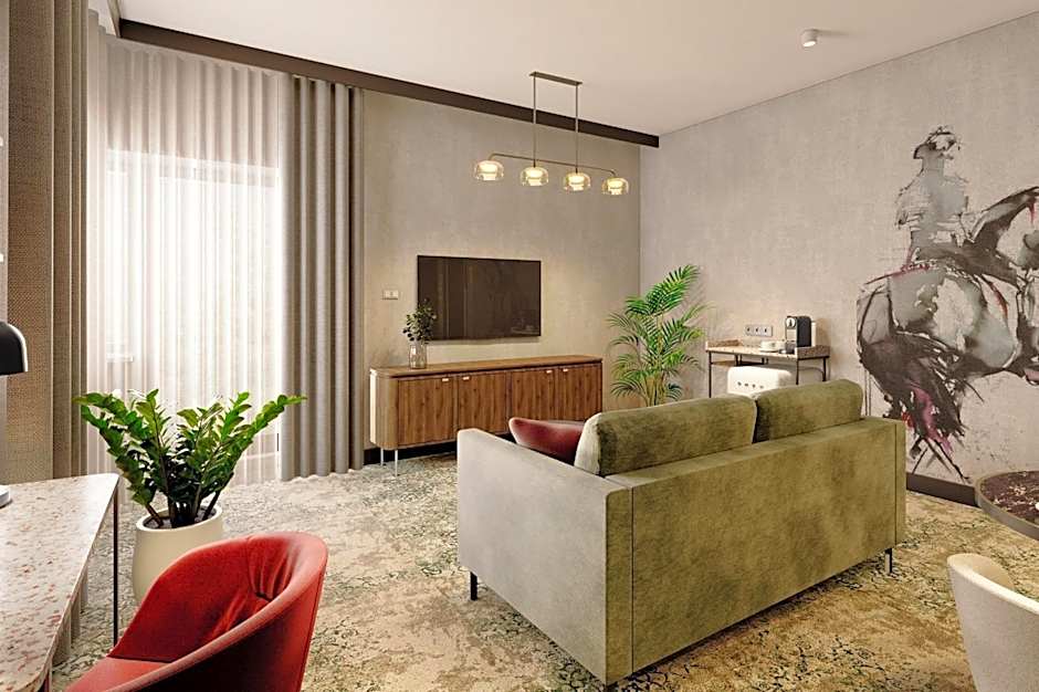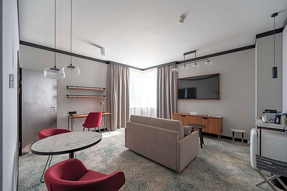 A large suite with a spacious seating area and a view of the Wawel Castle and the Old Town.